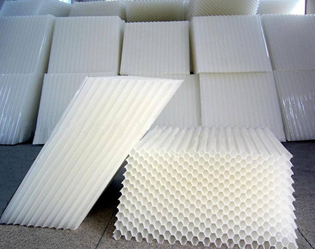 1、打開斜管填料包裝,將每一片斜管填料平放于地面,取二片斜管填料置于一片填料之上,檢查斜管填料的切口,必須保證60°角、并呈六角蜂窩狀,檢查無誤后開始燙接粘接點;