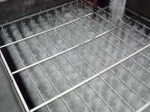 立體彈性填料篩選了聚烯烴類和聚酰胺中的幾種耐腐、耐溫、耐老化的優質品種,混合以親水、吸附、抗熱氧等助劑,采用特殊的拉絲,絲條制毛工藝,將絲條穿插固著在耐腐、高強度的中心繩上,由于選材和工藝配方精良,剛柔適度,使絲條呈立體均勻排列輻射狀態,制成了懸掛式立體彈性填料的單體,填料在有效區域內能立體全方位均勻舒展滿布,使氣、水、生物膜得到充分混滲接觸交換,生物膜不僅能均勻的著床在每一根絲條上,保持良好的活性和空隙可變性,而且能在運行過程中獲得愈來愈大的比表面積,又能進行良好的新陳代謝。